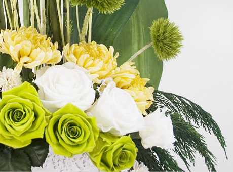 | 花 材 | バラ・キク・ローズリーフ・トクサ・実なしアイビー・ソフトシダ・エキノプス・ニゲラポリエンタリス(プリザーブドフラワー)ソーラーパールジュニア |